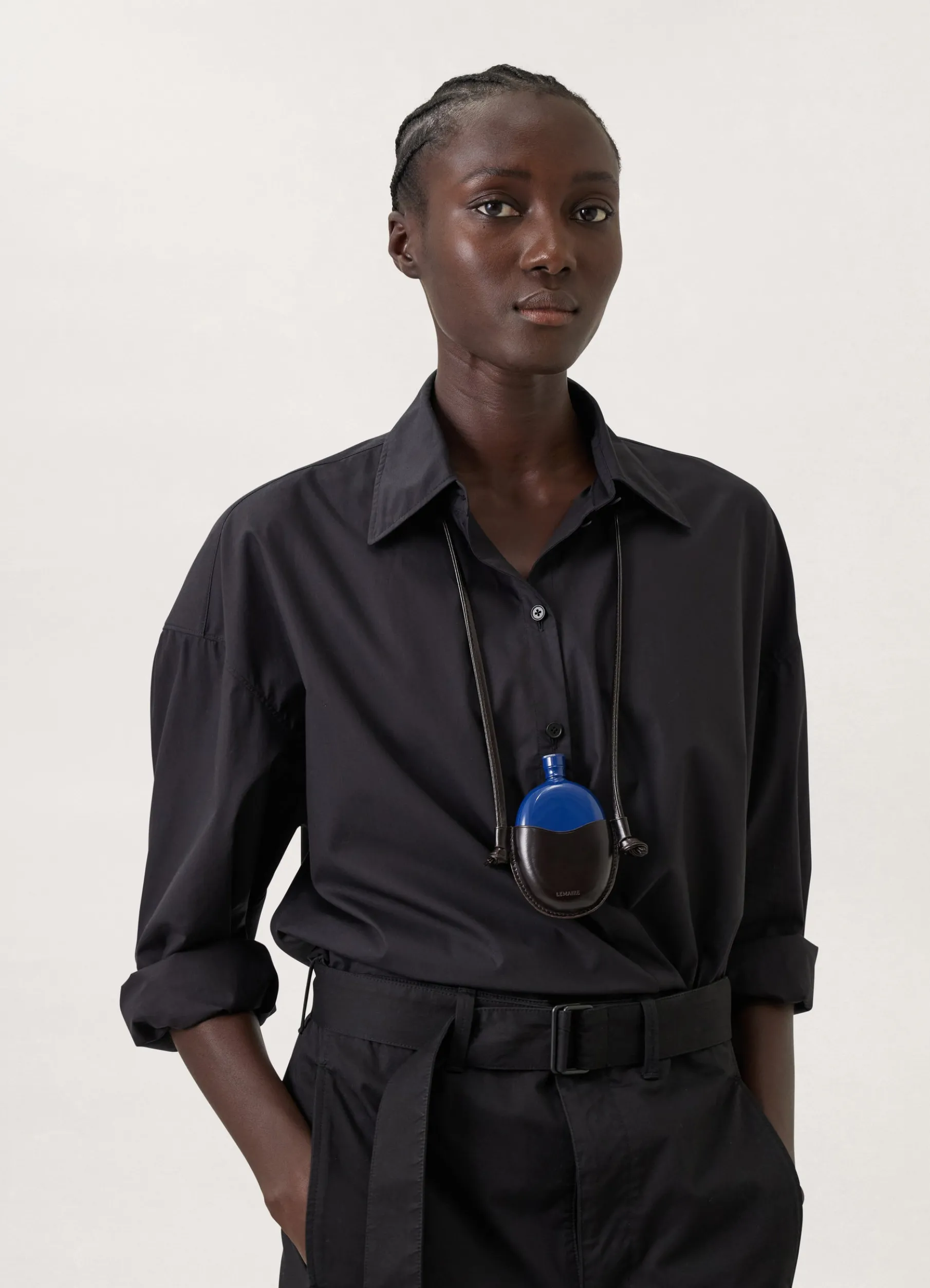 This Flask Necklace Is Made Of Vegetabletanned Leather With A Compact Grain And A Smooth Finish. It Consists Of A Leather Pouch That Is Attached To A Matching Cord That Can Be Worn Around The Neck, And Includes A Round Metal Flask That Fits Inside.
