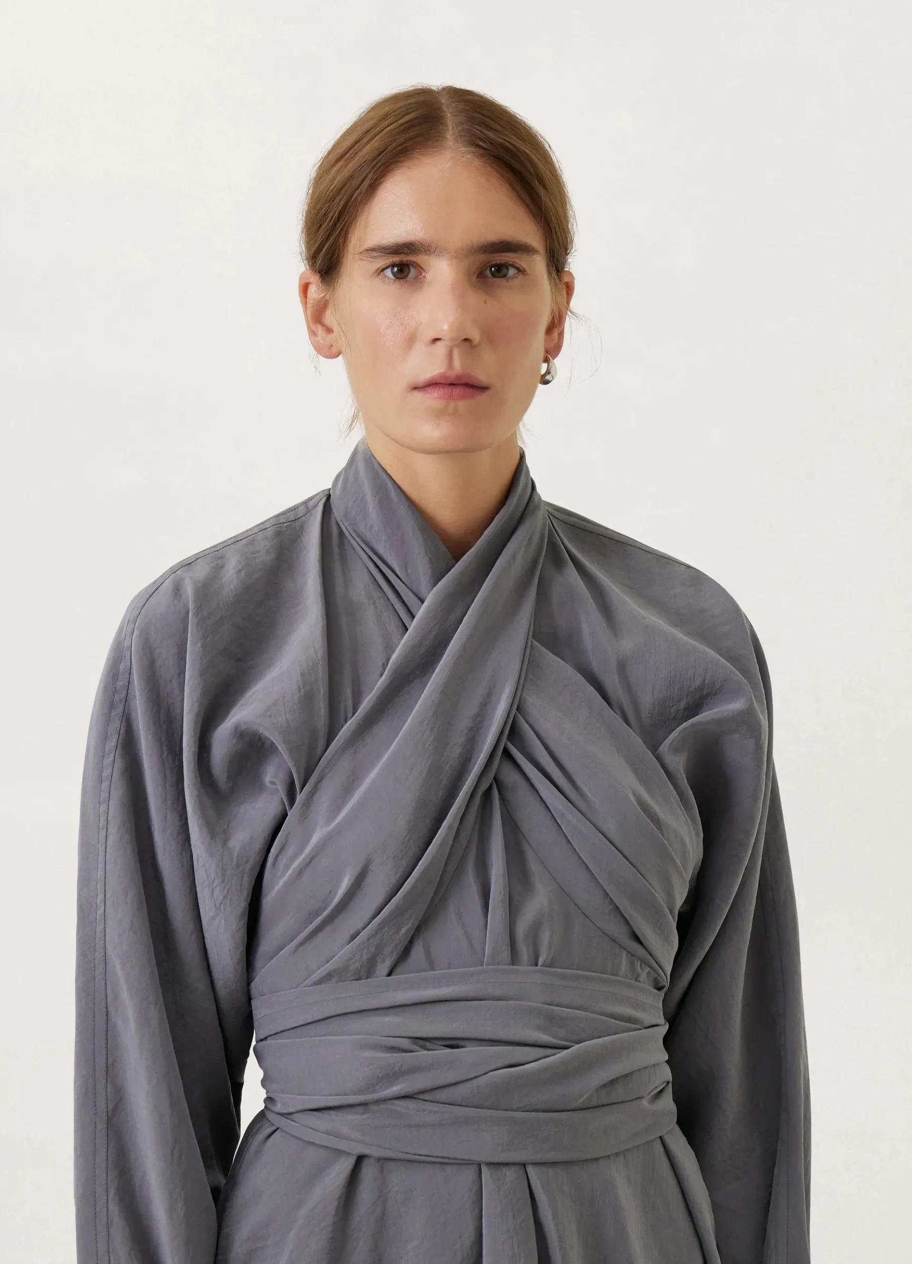 This Dress Is Made Of Dry Silk, A Classic Lemaire Fabric With A Soft Hand And Tonic Texture. This Adjustable Shape Features Crossed Front Panels That Evoke A Halterneck Sarong And Extend Into A Long Belt That Can Be Knotted In Multiple Ways. Other Details Include Kimono Sleeves And A Buttoned Back.