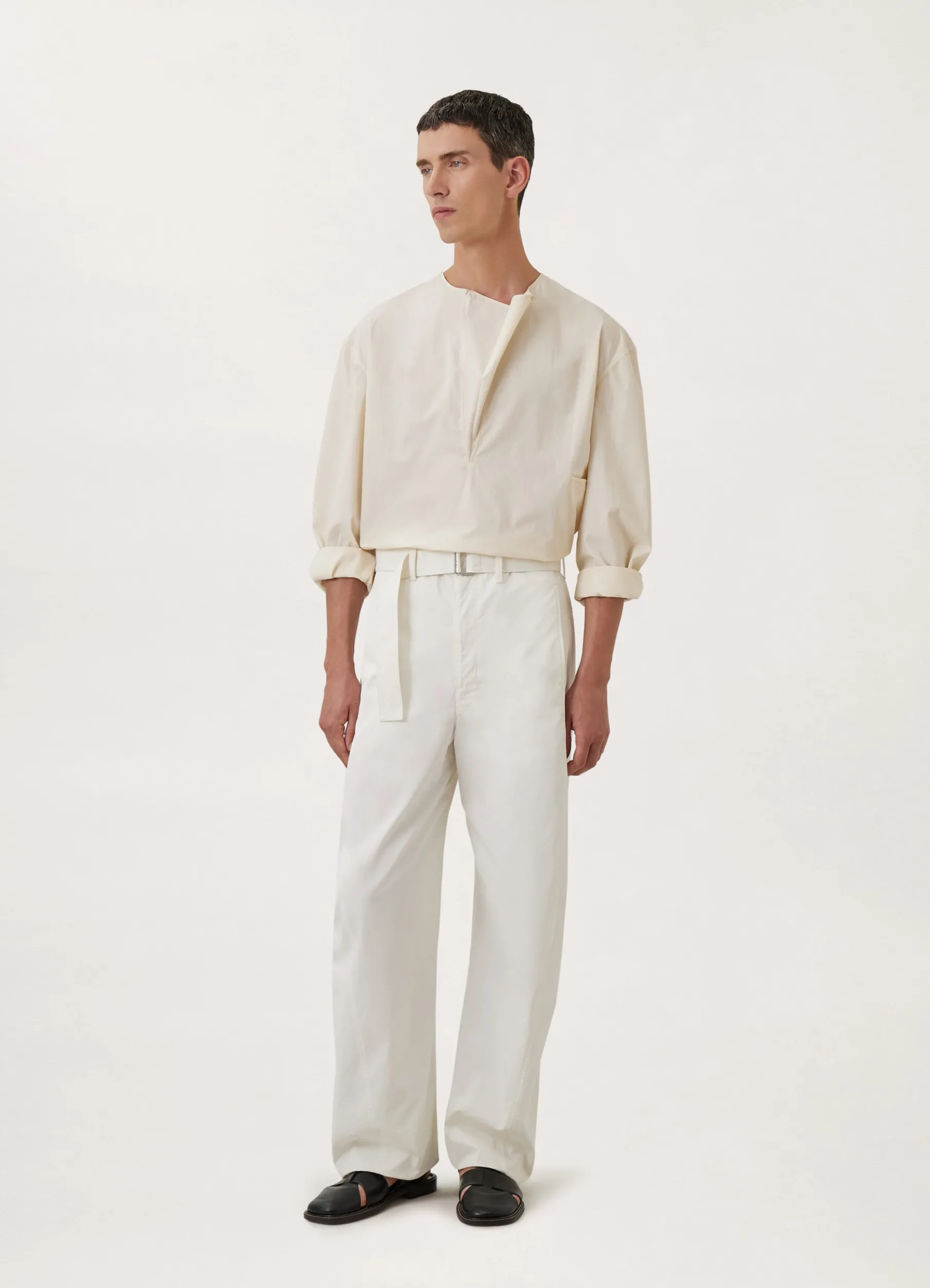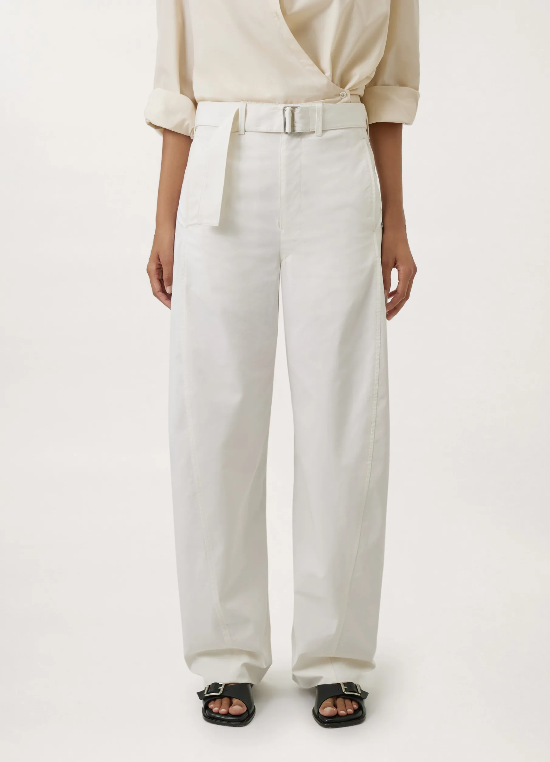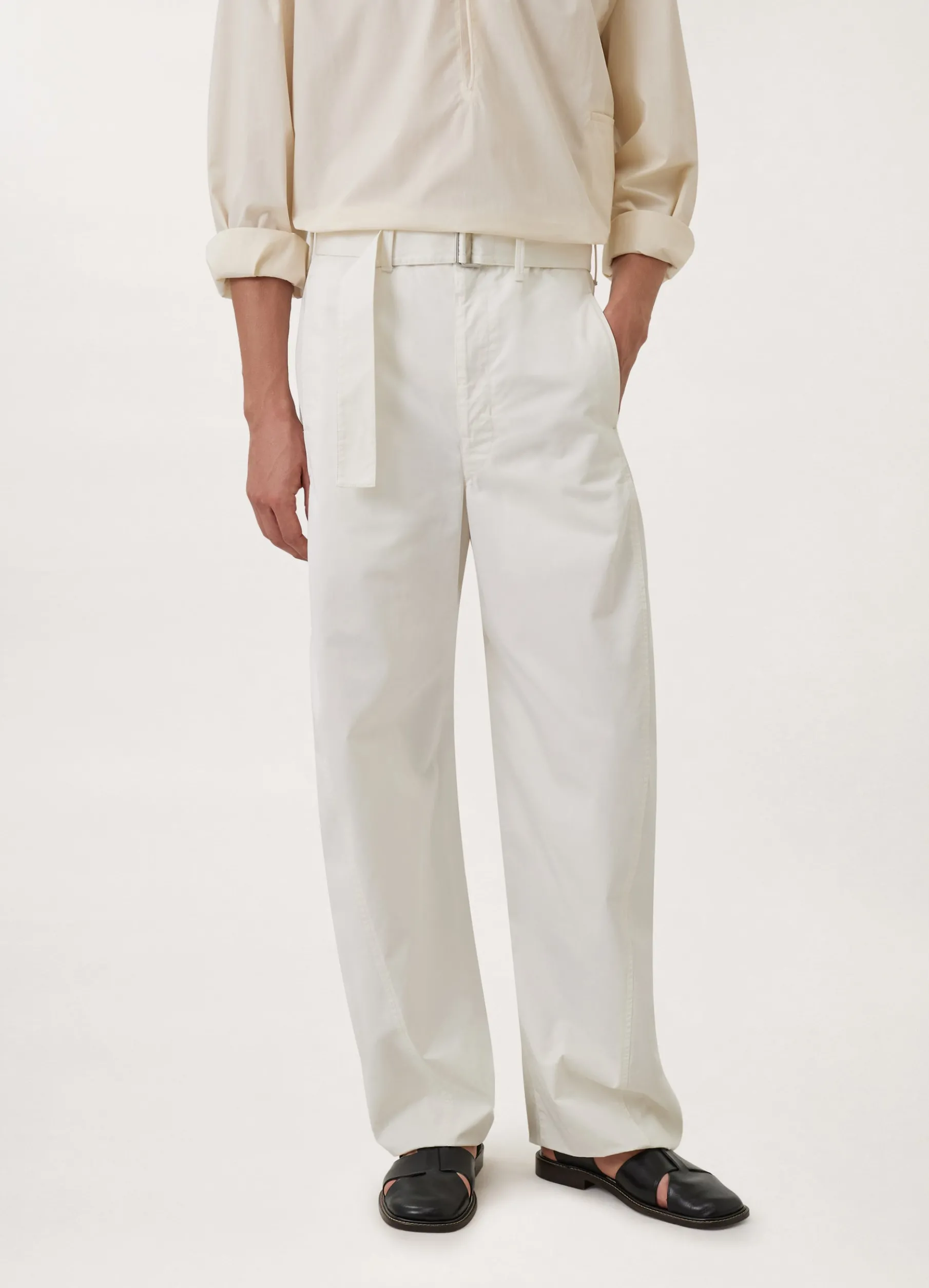 A New Addition To The Lemaire Twisted Family, These Unisex Pants Are Made From A Lightweight Cotton With A Visible Twill Weave. Their Sideseams Are Slightly Twisted Giving The Leg A Curved Shape. Details Include Two Side Pockets, A Jetted Pocket On The Back And Simple Topstitching. The Fit Is Elongated And Midrise, And Includes A Belt With Squared Edges To Adjust The Waist.