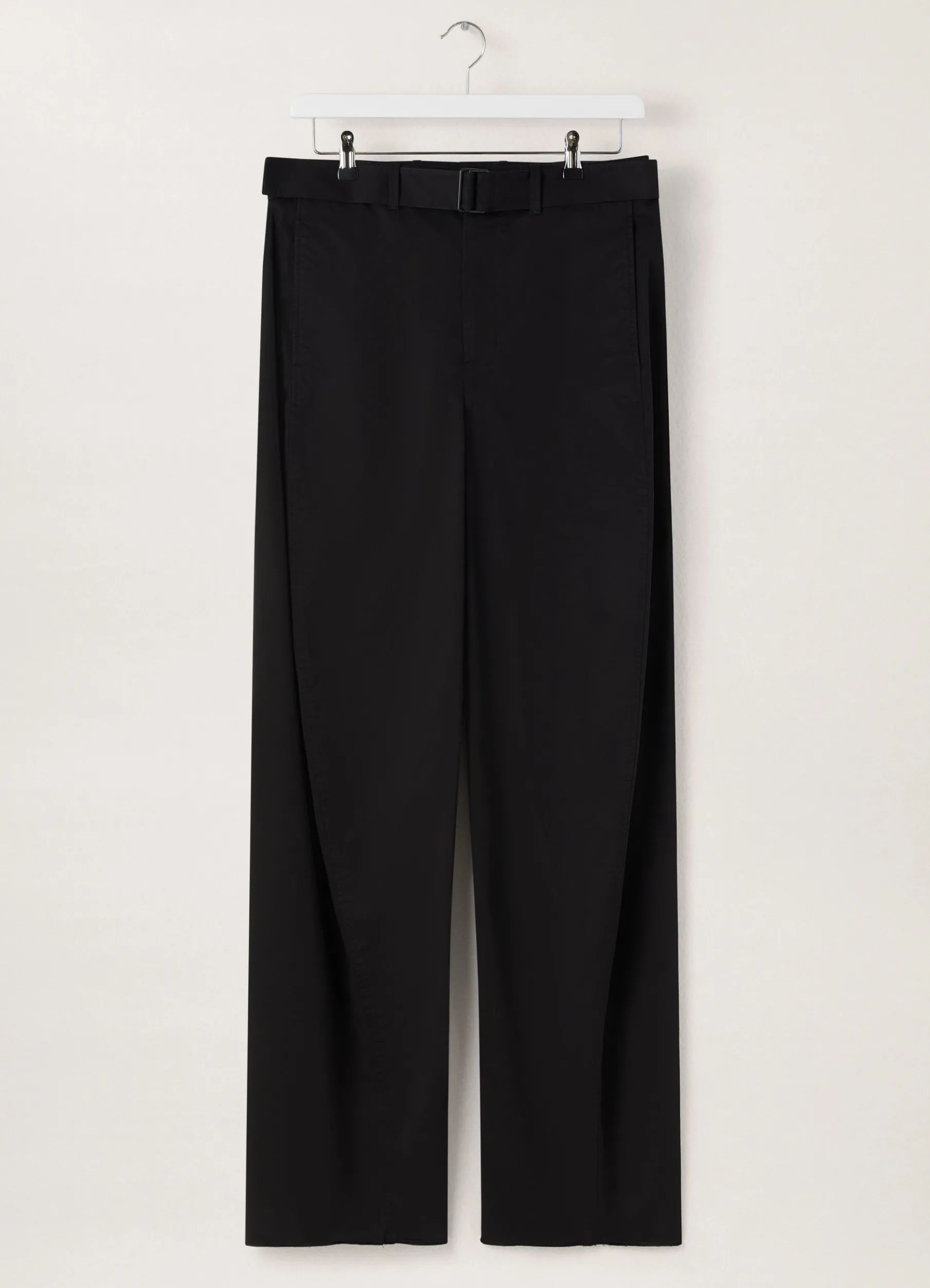 A New Addition To The Lemaire Twisted Family, These Unisex Pants Are Made From A Lightweight Cotton With A Visible Twill Weave. Their Sideseams Are Slightly Twisted Giving The Leg A Curved Shape. Details Include Two Side Pockets, A Jetted Pocket On The Back And Simple Topstitching. The Fit Is Elongated And Midrise, And Includes A Belt With Squared Edges To Adjust The Waist.