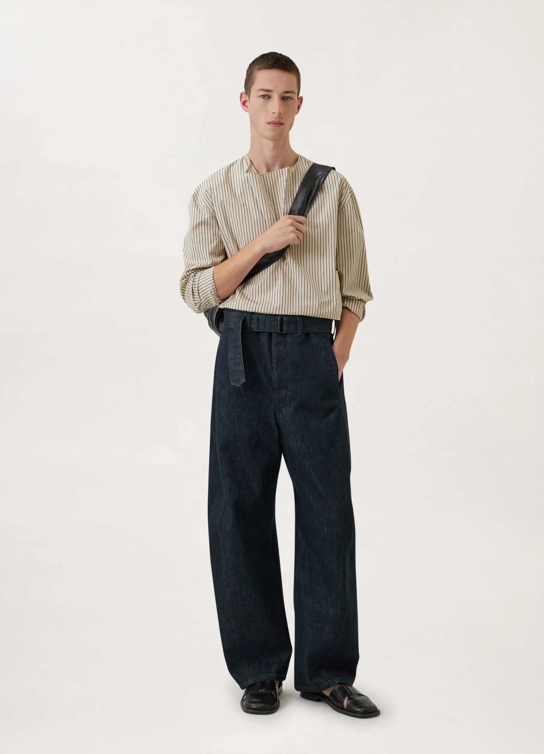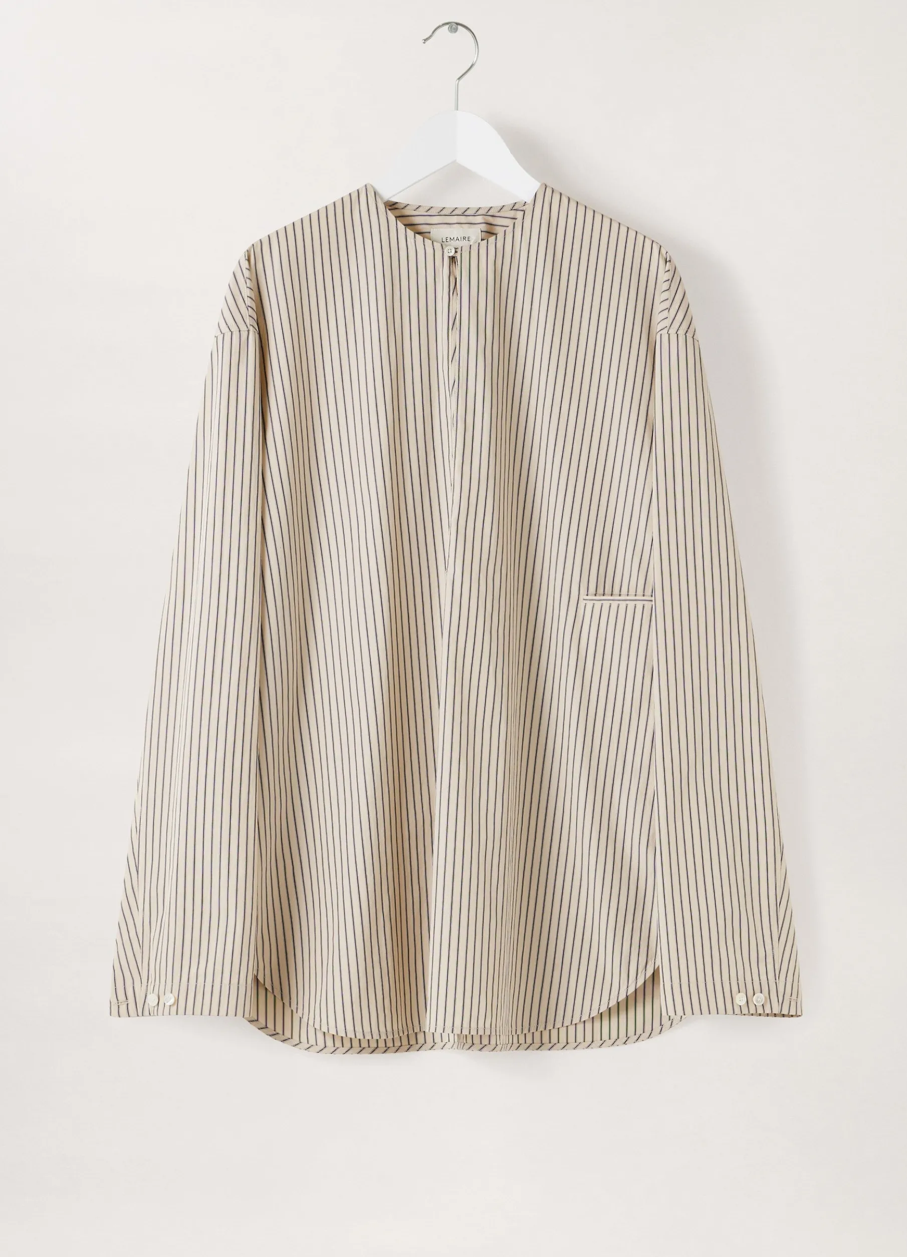This Shirt Is Made Of A Classic Striped Poplin With A Shiny And Smooth Surface. Its Relaxed Fit Features Dropped Shoulder And A Gusseted Crewneck With A Single Button Loop Closure That Can Be Left Open For A Draped Effect. It Has Dshaped Stitching At The Bottom Of The Gusset And A Horizontal Welt Pocket On One Side. Other Details Include Two Small Buttons On The Sleeves That Can Be Utilized To Create An Adjustable Pleat, A Slightly Rounded Hem That Is Open On Both Sides, And A Back Yoke.