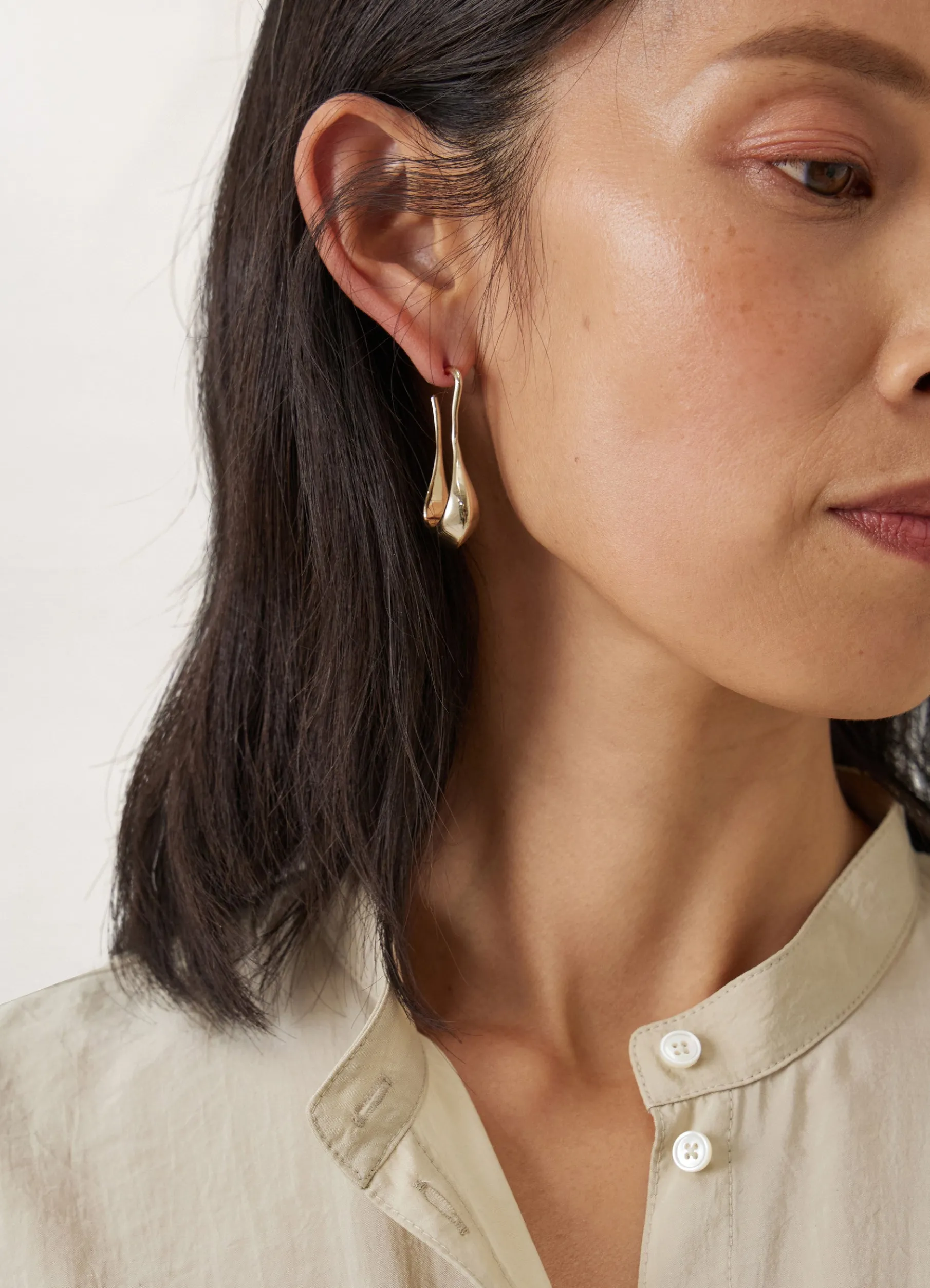 These Earrings Are Made From Bronze With A Gold, Silver Or Antique Bronze Finish And Are Shaped Like Two Small Falling Drops With Slightly Angular Edges.