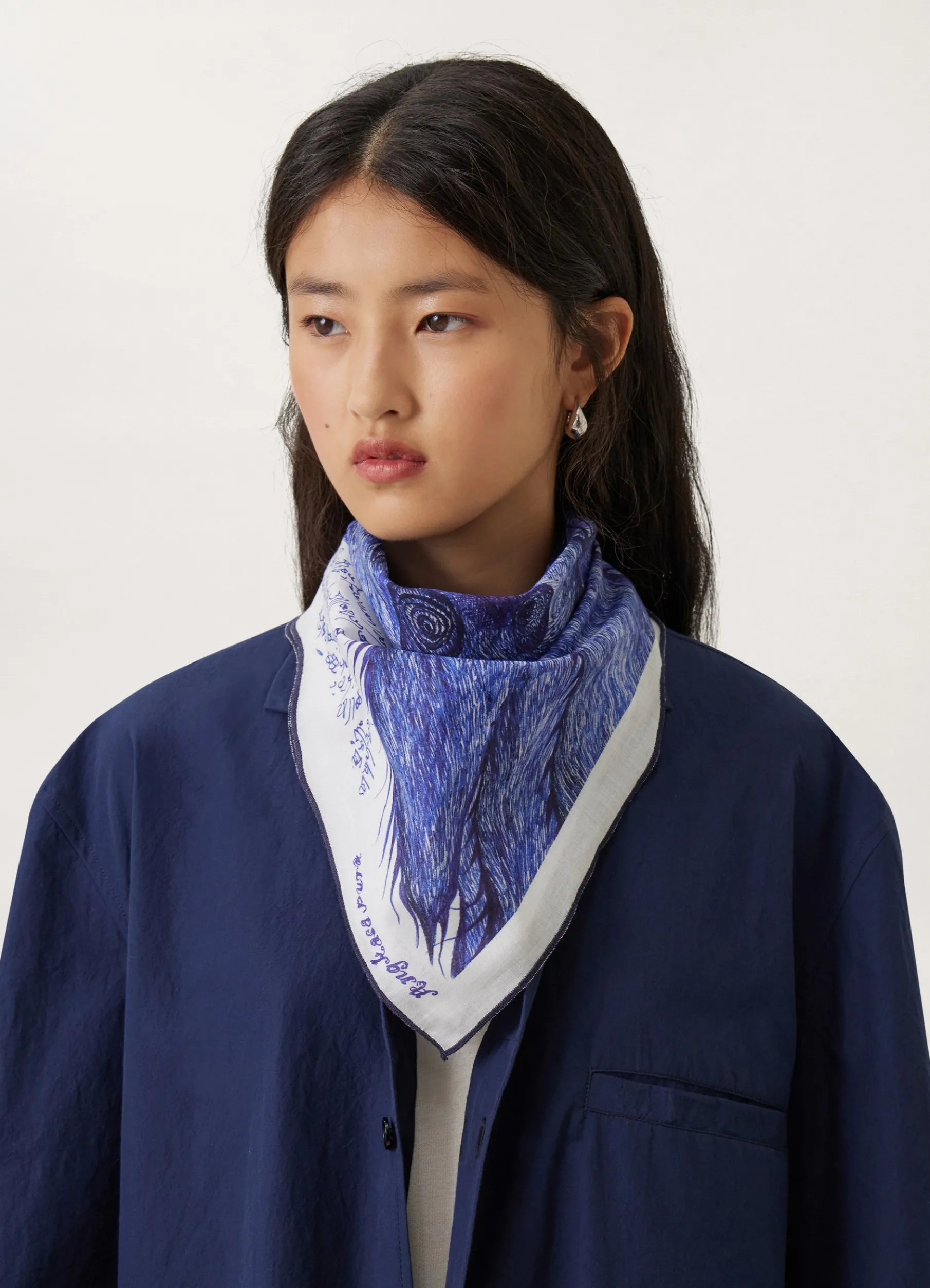 This Small Unisex Bandana Is Made Of Light Organic Cotton With A Reproduction Of An Artwork By Indonesian Artist Noviadi Angkasapura, That Has Been Printed To Scale To Respect Its Integrity. Its Border Is Asymmetrically Embroidered With Dark Blue Thread, Creating Cutout Shapes Along The Edges.
