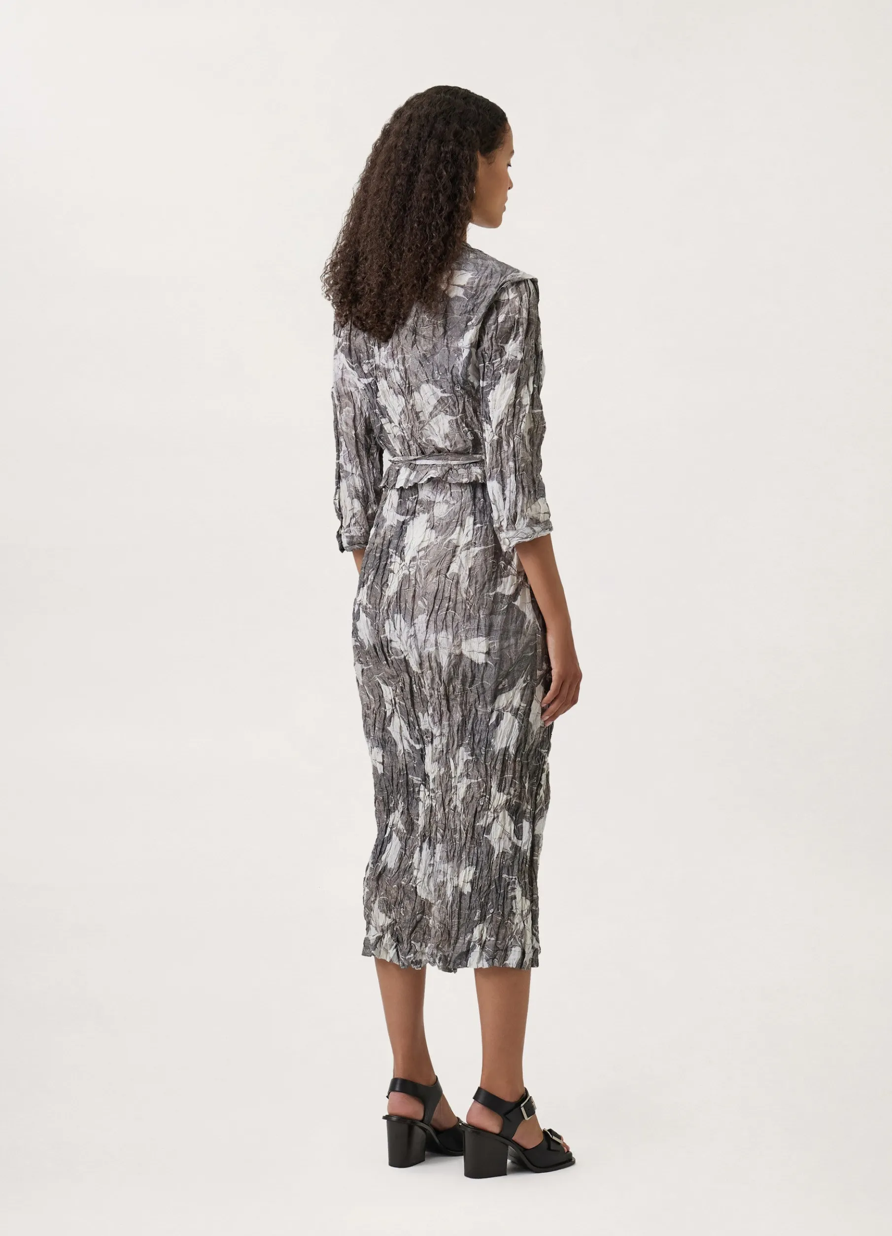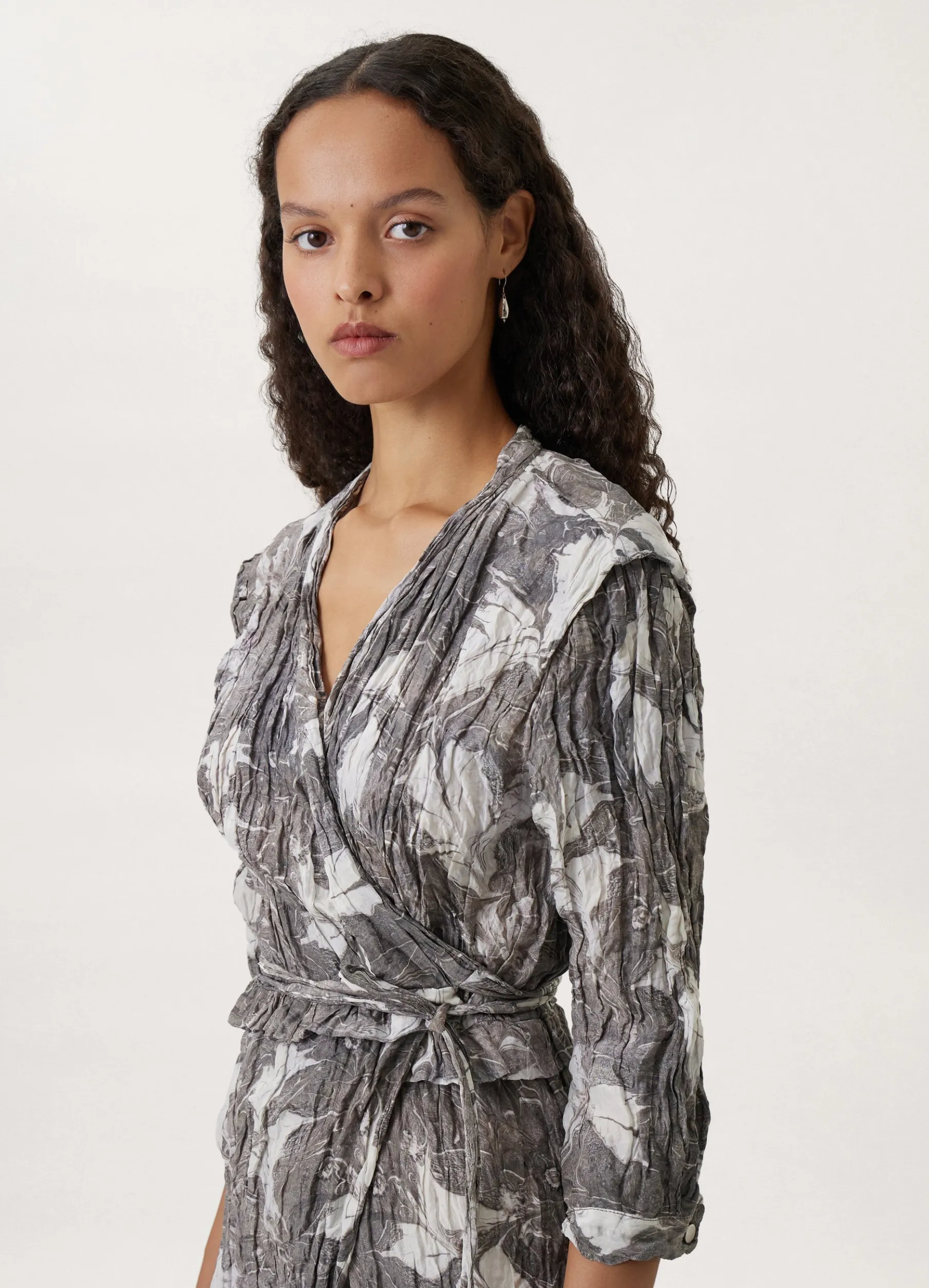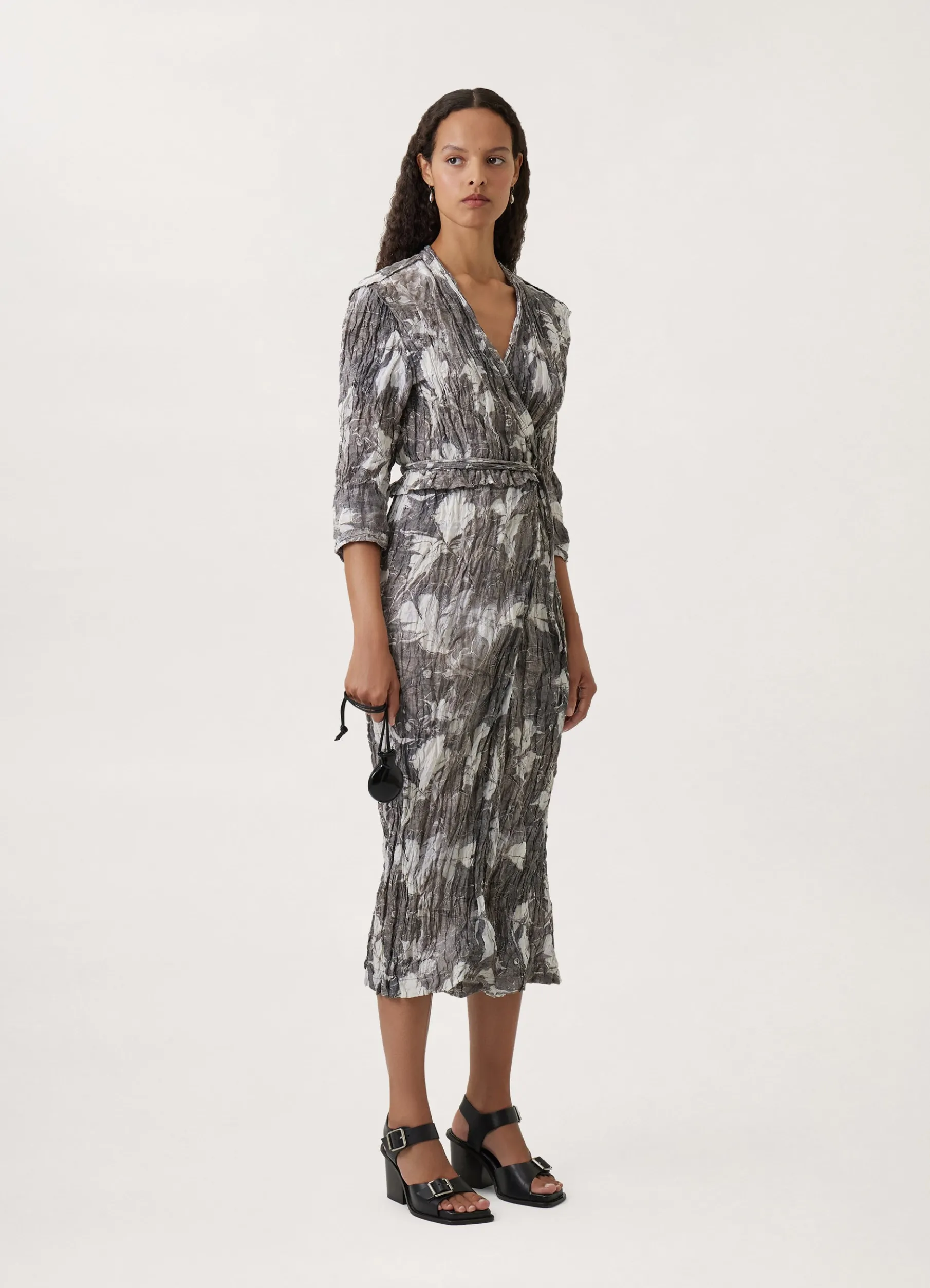 This Dress Is Made Of A Printed Silkviscose Blend That Has Been Woven With Metal Yarn, Giving It A Permanently Crinkled Texture. Its Wrapover Shape Features A Plunging Neckline, Boxpleated Shoulders, And Sleeves Cut To Midforearm. A Small Peplum Highlights Its Waistline, A Thin Belt Wrapping Around The Waist.