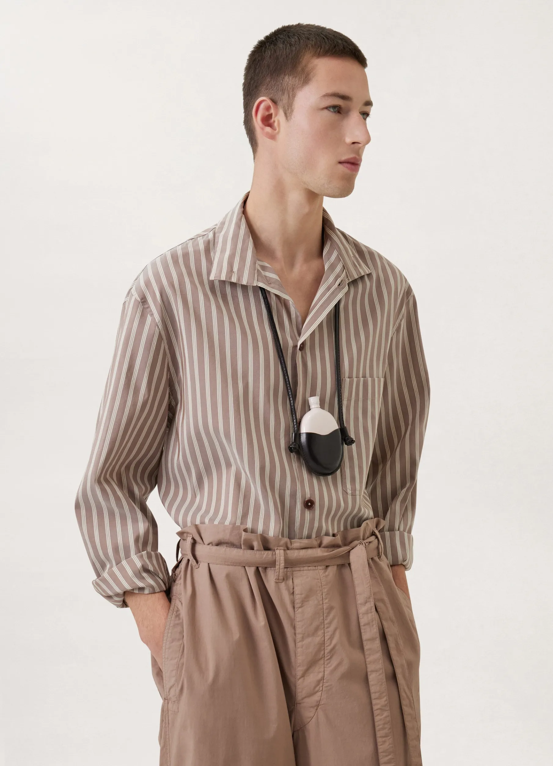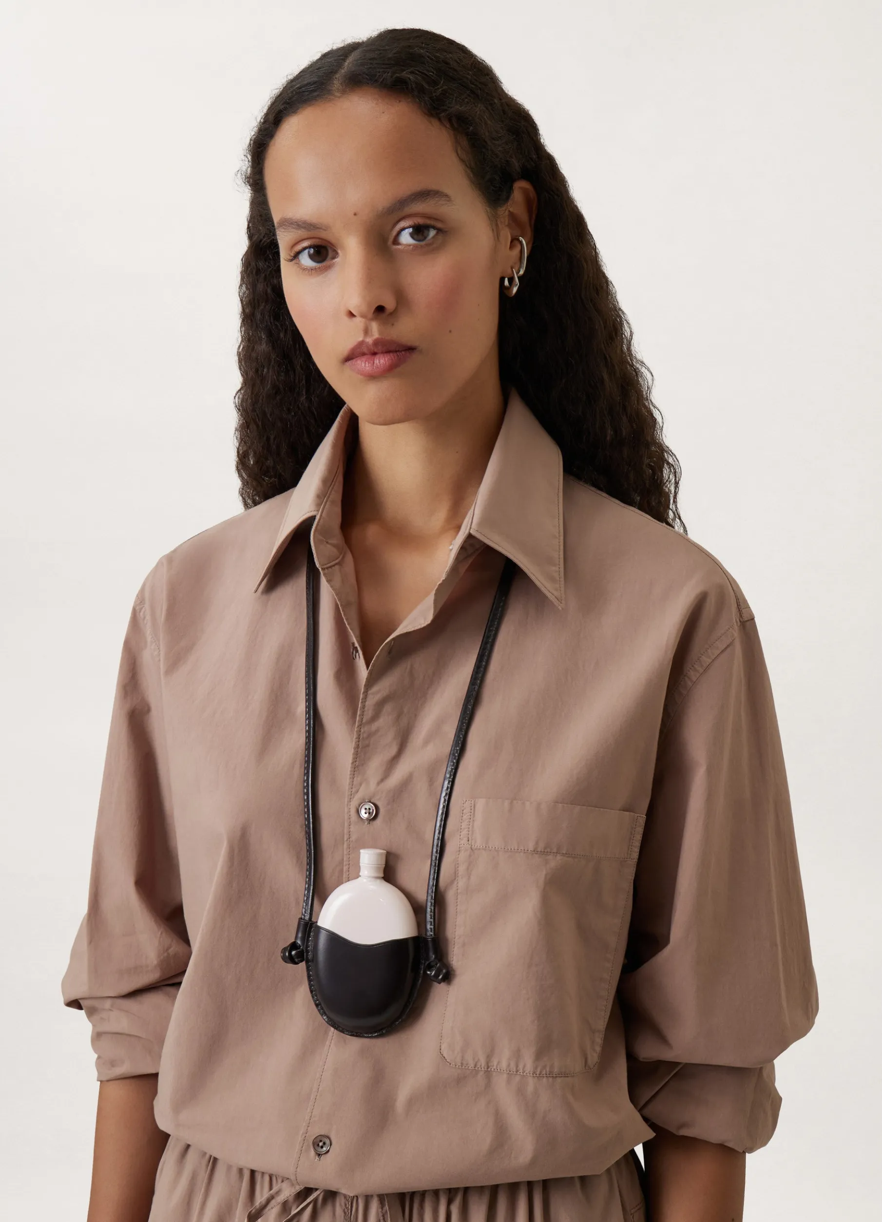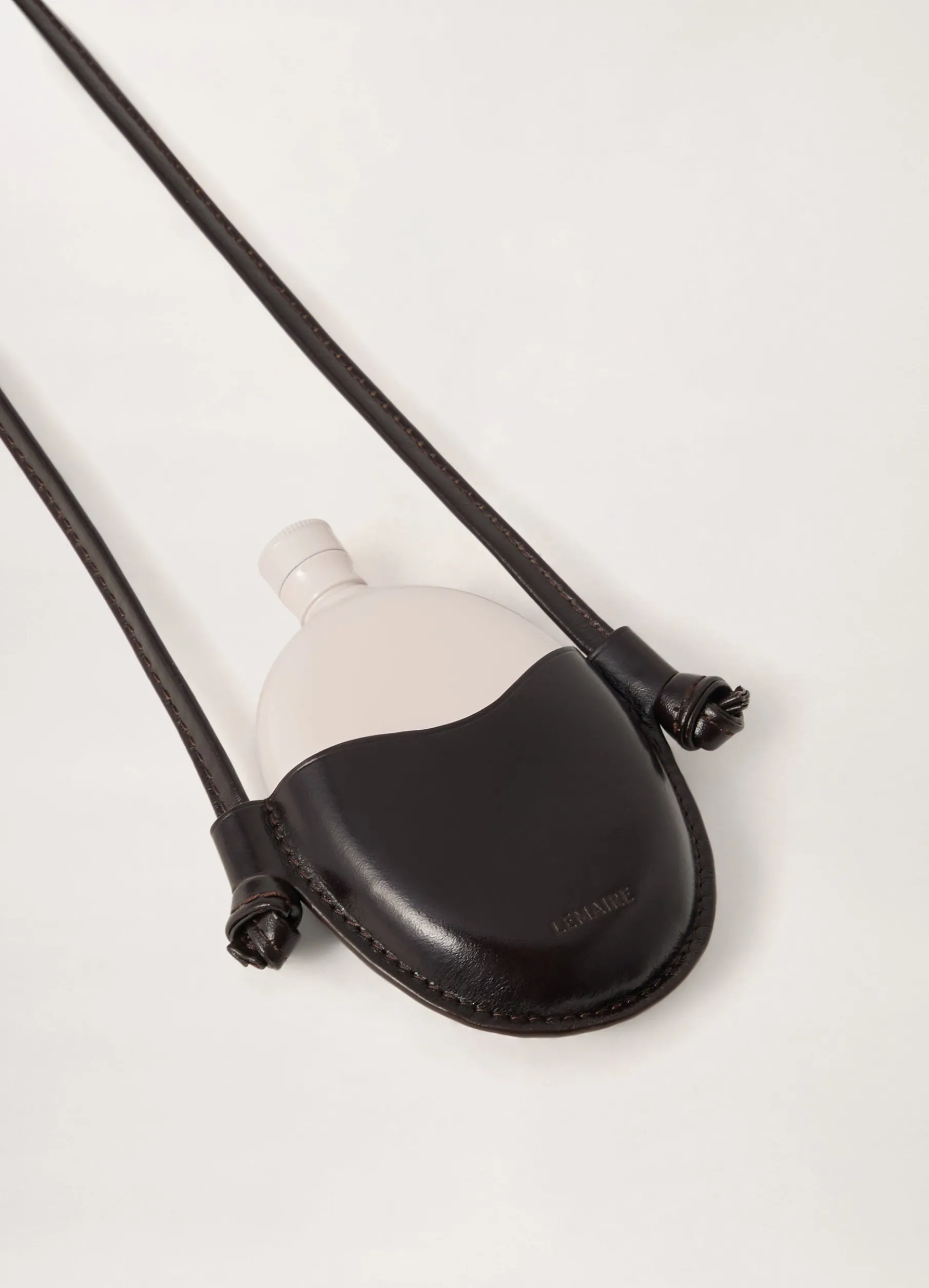 This Flask Necklace Is Made Of Vegetabletanned Leather With A Compact Grain And A Smooth Finish. It Consists Of A Leather Pouch That Is Attached To A Matching Cord That Can Be Worn Around The Neck, And Includes A Round Metal Flask That Fits Inside.