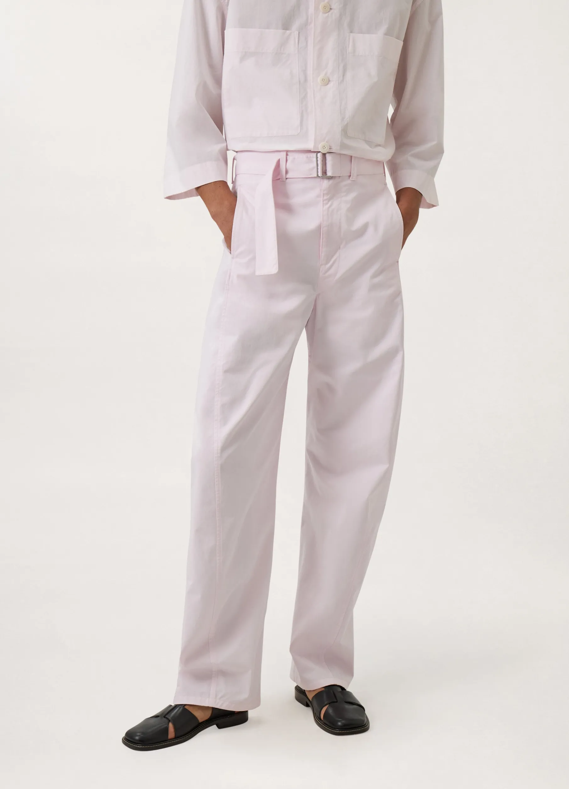 A New Addition To The Lemaire Twisted Family, These Unisex Pants Are Made From A Lightweight Cotton With A Visible Twill Weave. Their Sideseams Are Slightly Twisted Giving The Leg A Curved Shape. Details Include Two Side Pockets, A Jetted Pocket On The Back And Simple Topstitching. The Fit Is Elongated And Midrise, And Includes A Belt With Squared Edges To Adjust The Waist.