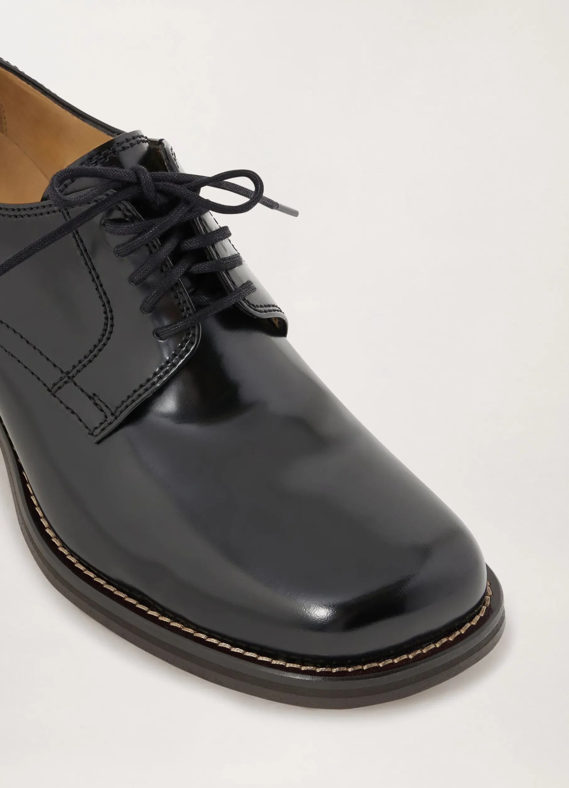 These Laced Derbies Are Made Of Structured Leather With A Smooth, Shiny Surface. Their Heeled Shape Features A Molded Squaretoed Vamp And Square Stacked Leather Heels.